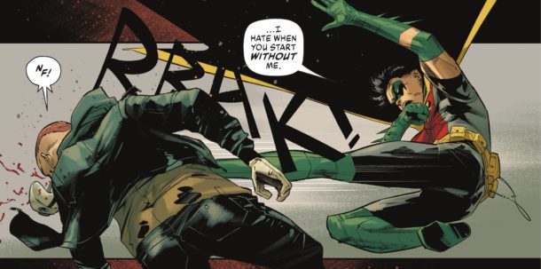 Il n’y a pas que du négatif dans Dark City. Tim Drake réussit son retour grâce à une bonne caractérisation de la part de Chip Zdarsky. Les dessins de Jorge Jimenez sont magnifiques. Ils dégagent un énorme dynamisme, très utile dans les trop nombreuses scènes d’action. Les couleurs de Tomeu Morey sont également très belles. Les deux espagnols forment un excellent duo (dynamique) artistique.