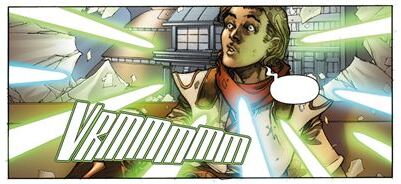 De plus, le scénariste lance son fil rouge, une prophétie autour de l’effondrement de l’ordre Jedi, qui risque de durer plusieurs numéros. Ce premier arc est plutôt bon, même si loin d’être transcendant. Il bénéficie des très beaux dessins de Brian Ching au style très précis. Le contraste est violent avec Travel Foreman qui dessine le chapitre 5. Le dessin manque de précision et les décors sont vides.