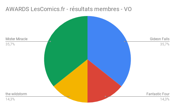 Les gagnants du collectif sont donc : Gideon Falls de Jeff Lemire et Andrea Sorrentino publié chez et Mister Miracle de TomKing et Mitch Gerads avec 35.7% des voix, chacun.