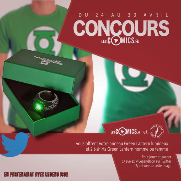 Rendez-vous donc sur twitter.com/LesComics_fr et tentez de gagner votre anneau Green Lantern et deux t-shirts, modèle homme ou femme.