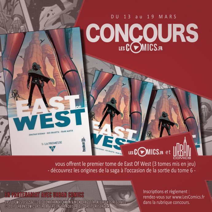 Cette semaine, Urban Comics et LesComics.fr proposent donc à 3 chanceux de repartir avec leur exemplaire de East Of West tome 1 afin de goûter la série et de découvrir cet univers.