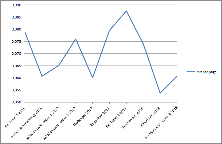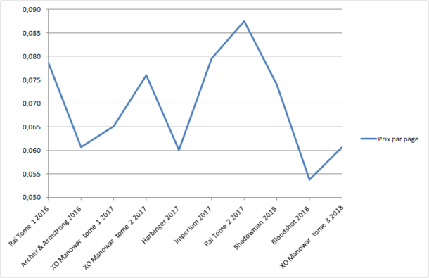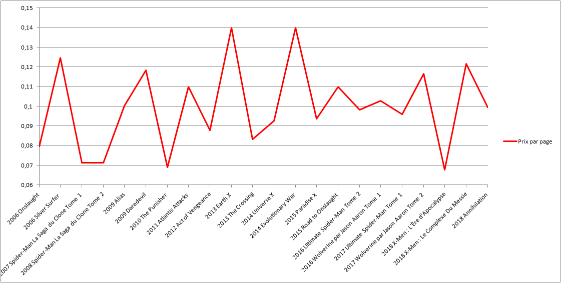 Jetons donc maintenant un œil à l’évolution du prix par page sur cette gamme. Dans les extrêmes, nous voyons donc que Earth-X a un prix par page deux fois supérieur à celui de The Punisher. Ce ne sont que les extrêmes. Pourtant, de pareilles disparités se retrouvent tout au long de l’histoire de ce format.