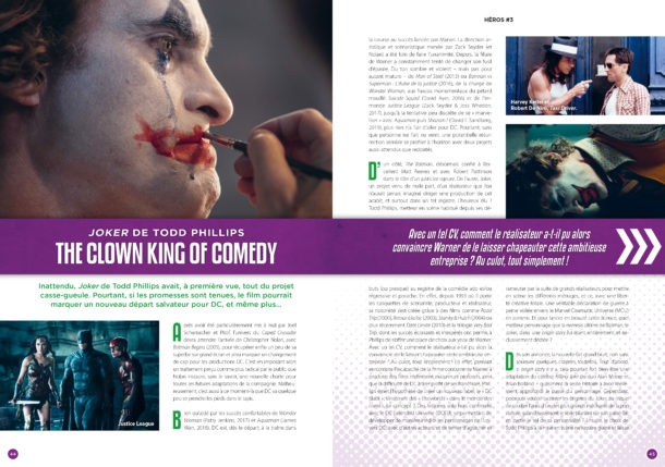 Des sept décennies de comics où il apparaît, en passant par ses diverses interprétations audio-visuelles à la télévision et au cinéma (César Romaro, Jack Nicholson, Mark Hamill dans les séries animées et les jeux-vidéos, Heath Ledger, Zach Galifianakis dans Lego Batman, Jared Leto et Joaquin Phoenix donc), plongez dans les presque 130 pages focalisées sur l’un des “bad guy” les plus appréciés de la culture pop’. Mise à part les comics, la télé et le ciné, les rédacteurs nous replongent aussi dans l’inspiration qui a amené Bob Kane, Bill Finger et Jerry Robinson à créer ce personnage dérangé et vite devenu inévitable pour se confronter au Batman qu’il l’a un jour fait tombé accidentellement dans une cuve de produits chimiques.