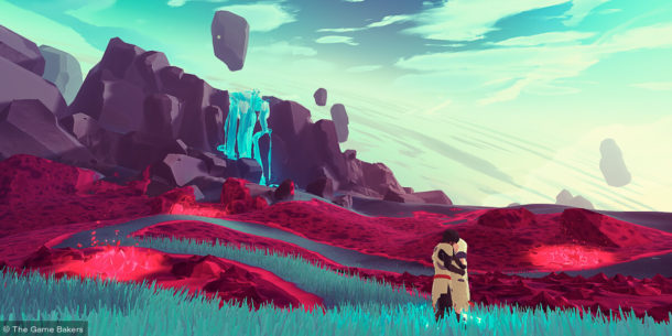 L’herbe haute vert-bleue, les rochers gris-pourpre, les grandes étendues nuageuses, sont la pour donner envie au joueur de glisser, explorer, et passer du temps avec Yu et Kay. Les changements d’ambiances au cours de la journée, les contrastes de couleurs entre environnement et créatures, pousse le joueur a aller voir ce qu’il se cache derrière la prochaine colline.