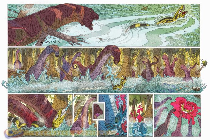 Pourtant, l’auteur a préféré le dynamisme et l’originalité de ses pages à la précision de son trait. Résultat, il m’est arrivé de ne pas savoir quel dinosaure je regardais, le “héros” ou une autre bestiole, dans certaines scènes de combats. Du coup, j’ai pu parfois mettre quelques cases à réaliser que je suivais un protagoniste secondaire et non pas le Spinosaure principal. Dommage…