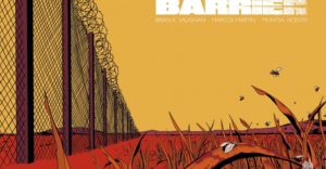 Si vous avez déjà lu plusieurs de mes chroniques, vous savez à quel point je suis attaché à la beauté de l’objet que représente un ouvrage. Si Barrier et son format à l’italienne (comme 300, par exemple) apparaissent difficiles à ranger dans une bibliothèque, il n’en demeure pas moins que cela rend l’ouvrage atypique et crée un chaos esthétique délicieux. La couverture au design épuré et aux couleurs chaudes, avec son grillage barbelé qui s’étend à l’infini sur une plaine aride et ocre du sud des Etats-Unis est pleine de symbole et donne tout de suite envie de se plonger dans la lecture de l’ouvrage. Les plus aguerris verront l’humeur vitrée de leurs yeux bouillonner en lisant les noms des auteurs : Brian K. Vaughan, Marcos Martin et Muntsa Vicente, trio talentueux qui nous avait offert The Private Eye (probablement l’un des meilleurs one shot indé de ces dix dernières années).