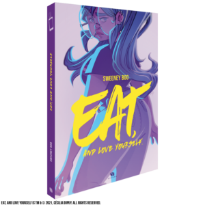 Sweeney Boo est une artiste dont j’apprécie particulièrement le style. Moderne, très dynamique, porté par une emphase sur les visages des personnages, je la suis depuis quelques temps sur Twitter et vous devriez faire pareil ! Quand j’ai appris qu’elle sortait un comics, j’étais curieux et emballé. Elle officie en tant que scénariste et dessinatrice sur ce projet répondant au nom de Eat and Love Yourself et que Ankama publie chez nous, en France.