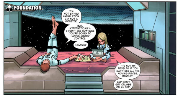 Cette énorme bataille cosmique aurait pu être la fin du run de Jonathan Hickman. Pourtant, le scénariste continue. Le rythme devient plus posé. Hickman continue et conclut des fils scénaristiques, principalement autour de Franklin et ValeriaRichards. La famille est le sujet central. Il crée une belle dynamique avec les enfants de la Fondation du Futur. Il met en place des éléments pour son run sur les Avengers (retour sur Terre de Flèche Noire, l’amitié entre T’Challa et Reed). C’est moins fou, mais cela reste passionnant à lire.
