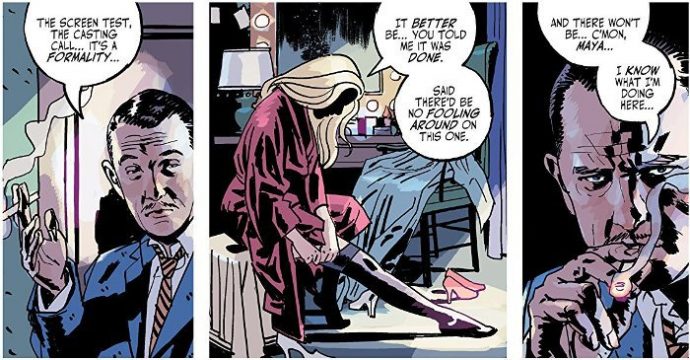 Dans le monde des comics contemporain, le terme “polar” est souvent associé à Ed Brubaker. L’auteur américain a déjà signé de très bons titres dans cette catégorie : Velvet, Gotham Central, Fatale, Captain America – The Winter Soldier, Daredevil et bien d’autres. C’est cette fois le souvenir d’un de ses oncles, scénariste hollywoodien de l’époque, qui l’a poussé à écrire une histoire sur le monde du cinéma à la fin des années 40, le tout saupoudré évidemment d’une intrigue policière. Le retour à cette période est l’occasion de mêler plusieurs thèmes autour de cette enquête : le trauma d’une guerre récemment terminée, la pression des producteurs de ciné et des studios , la chasse aux sorcières des communistes et de leurs sympathisants, la ségrégation raciale, les mœurs débridées et pas toujours clean du tout Hollywood. On se retrouve donc dans une ambiance à la James Ellroy dans ses romans L.A Confidential ou encore Le Dahlia noir (adaptés d’ailleurs au ciné) où le monde est plongé dans un total pessimisme et la société gangrenée par la corruption. Rien de très joyeux mais c’est cette ambiance de l’époque qui a toujours fait écho des décennies plus tard dans la culture populaire. Donc oui, le récit n’est sans doute pas forcément original sur le fond, mais sur la forme, Brubaker a toujours sa touche personnelle pour rendre un récit accrocheur, documenté et intéressant.