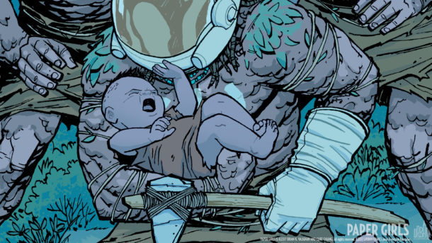Paper Girls exerce sur moi une sorte de magie. Le titre est difficile à résumer mais il est intriguant, très prenant à lire et addictif. Les personnages sont particulièrement bien écrits et l’auteur soigne leurs réactions à tous types d’événements, qu’il s’agisse de l’apparition de créatures inédites ou de l’apparition de leurs premières règles. Car oui, elles peuvent apparaître n’importe quand, même dans une époque qui n’est pas la leur. Ces filles sont pleines des préjugés de leur époque et les transportent avec elles. Elles ont chacune une personnalité bien marquée et les rencontres qu’elles font au fil des épisodes de la série influencent leur caractère et leur perception du monde. De ce point de vue aussi, le travail de Brian K. Vaughan est exemplaire.