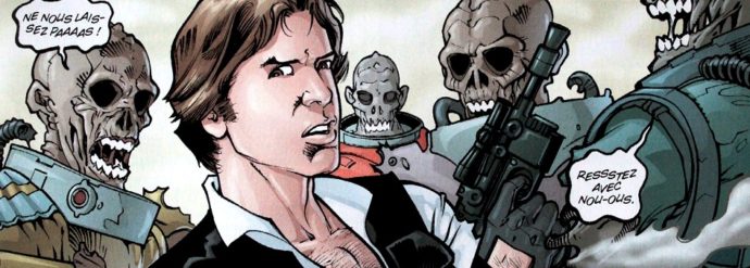 Une courte histoire mêlant SF et horreur avec le duo Solo/Chewie bloqué sur une planète hantée avec une cargaison importante d’un client. Signé Steve Niles et dessiné par Davide Fabbri, un habitué des titres Star Wars chez Dark Horse Comics. Une bonne histoire montrant le bon cœur qu’a finalement le contrebandier coréllien, malgré une erreur chronologique assez visible pour une histoire censée se passer avant SW Ep IV : A New Hope. A vous de la trouver ! 😉