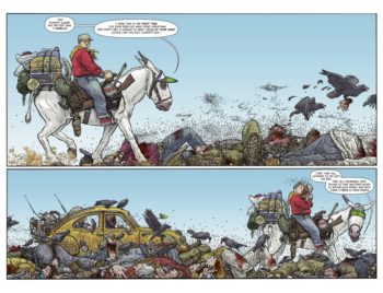Mais Shaolin Cowboy, c’est aussi et surtout un festival graphique. C’est aussi une débauche de détails et de références qui font de chaque planche une œuvre d’art. Geof Darrow nous offre également un spectacle visuel époustouflant, où chaque case regorge de détails à découvrir. Il nous plonge dans un univers délirant et absurde. L’humour noir et le second degré sont omniprésents.