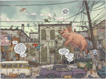 Quelle est la particularité du dessin de Geof Darrow ? C’est sa capacité à créer des planches d’une richesse et d’une précision incroyables. Chaque case est un véritable tableau, où le moindre détail est soigné et réaliste. Que ce soit les personnages, les décors, les objets ou les animaux, tout est dessiné avec un souci du réalisme et de la proportion. Le dessin de Darrow est un mélange d’influences européennes, notamment Moebius et Bilal, et de influences japonaises, notamment Otomo et Tezuka.